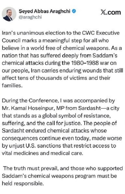Iran’s unanimous election to the CWC Executive Council marks a meaningful step for all who believe in a world free of chemical weapons. As a nation that has suffered deeply from Saddam’s chemical attacks during the 1980–1988 war on our people, Iran carries enduring wounds that still affect tens of thousands of victims and their families.